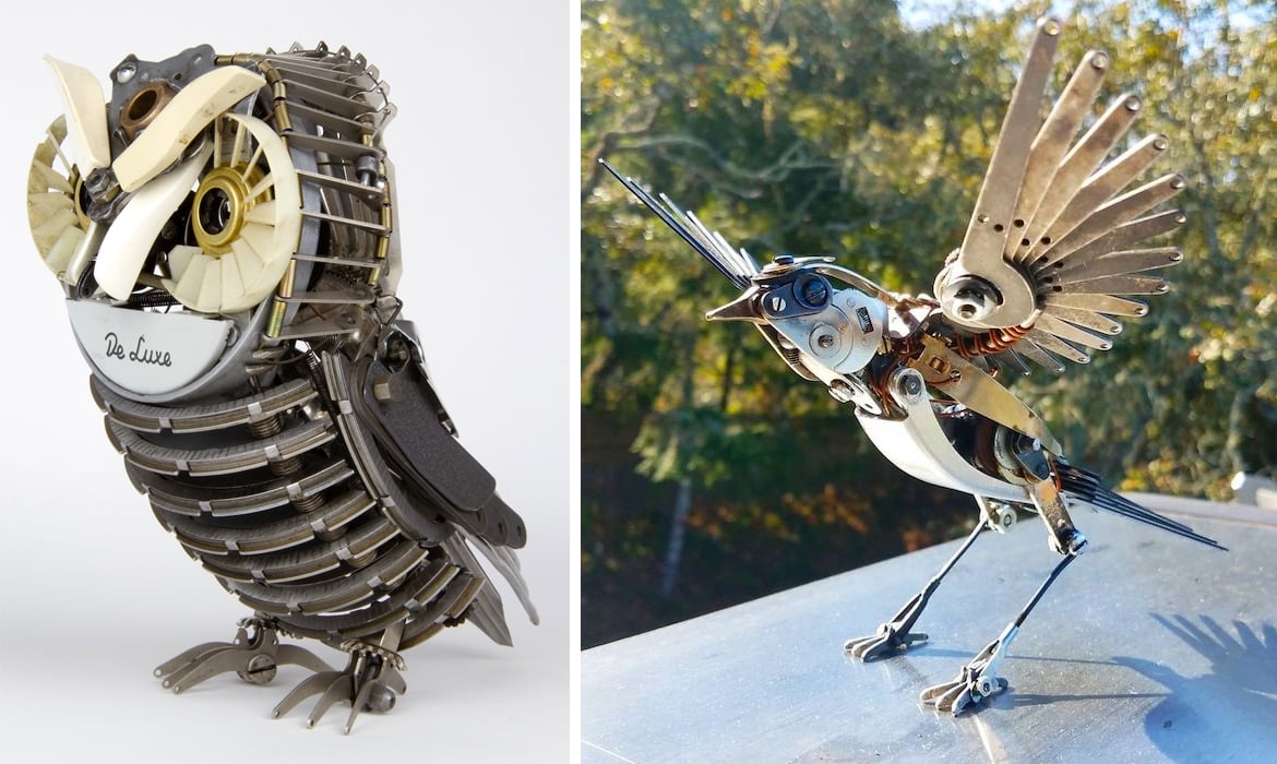 Artista desarma máquinas de escribir antiguas para crear esculturas de pájaros