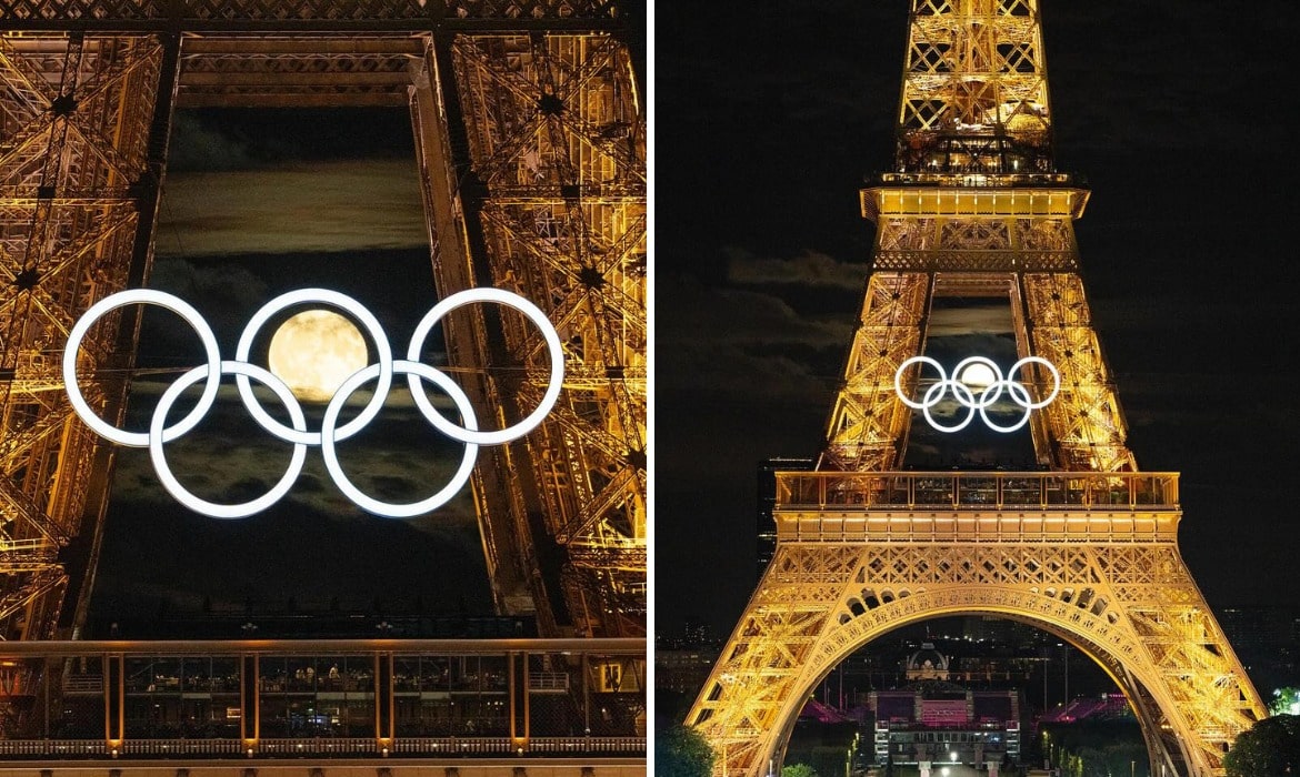 Majestic Photo of the Full Moon Inside the Eiffel Tower’s Olympic Rings